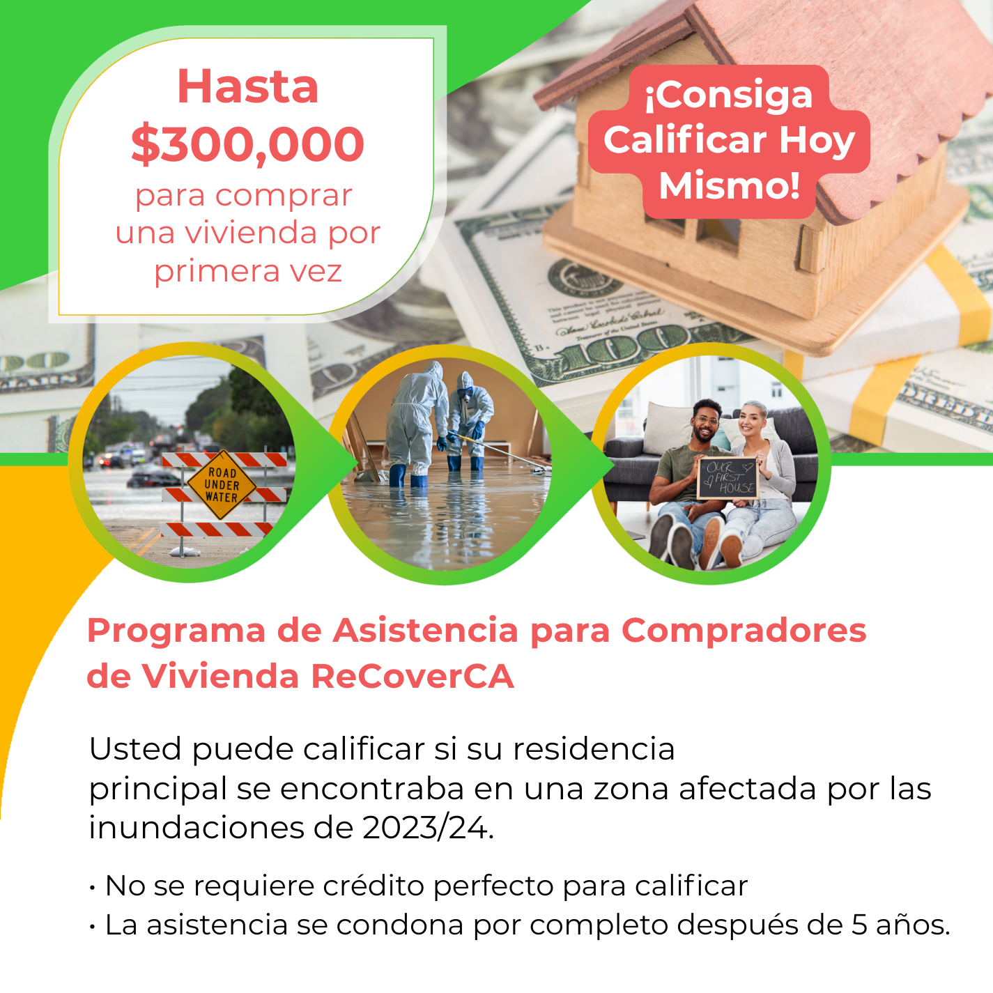 A bright green, yellow, and white Spanish-language graphic promoting the Programa de Asistencia para Compradores de Vivienda ReCoverCA. At the top, a small wooden house sits on stacks of $100 bills with a red banner that reads “¡Consiga Calificar Hoy Mismo!” On the left, bold coral-colored text says “Hasta $300,000 para comprar una vivienda por primera vez.” Below are three circular photos showing a flooded street, cleanup workers in protective suits, and a smiling couple holding a sign that says “Our First House.” The text explains that renters affected by the 2023–2024 floods may qualify for assistance, which is forgivable after 5 years and does not require perfect credit.