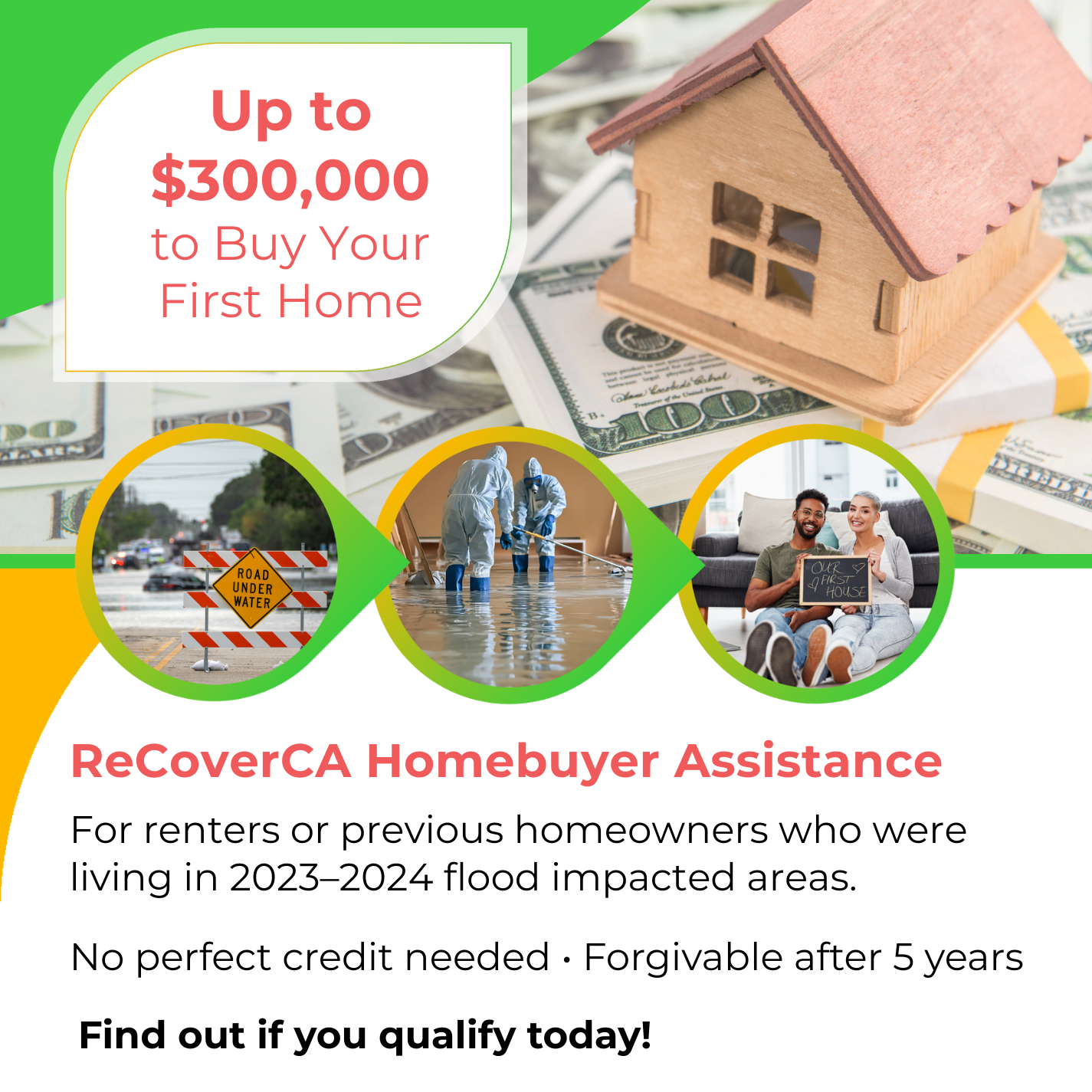 A bright green and white graphic promoting the ReCoverCA Homebuyer Assistance Program. The top shows a small wooden house on stacks of $100 bills with text reading “Up to $300,000 to Buy Your First Home.” Three circular photos depict a flooded road, cleanup workers, and a happy couple holding a sign that says “Our First House.” The message explains that renters or previous homeowners from 2023–2024 flood-impacted areas may qualify for assistance—no perfect credit needed and forgivable after 5 years. The bottom invites viewers to “Find out if you qualify today!”