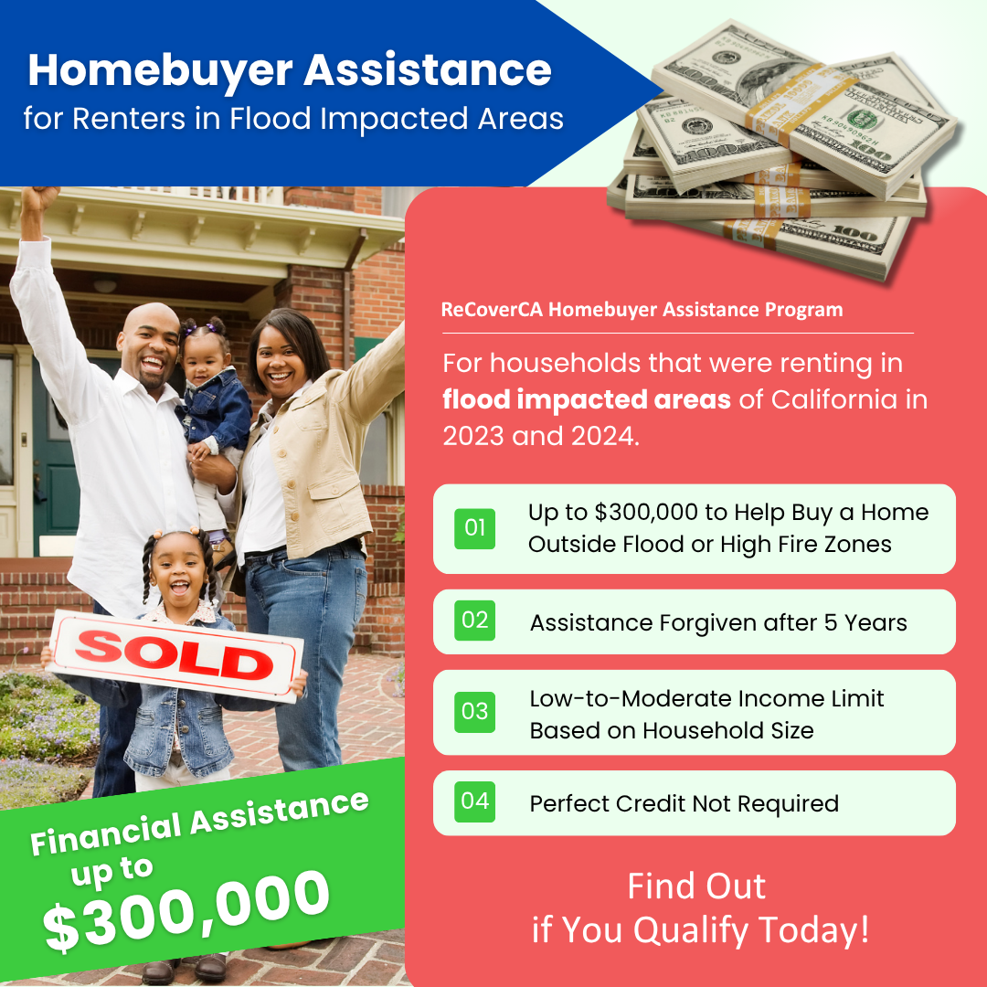 The ReCoverCA Homebuyer Assistance Program provides up to $300,000 in forgivable loan assistance to help low- and moderate-income households impacted by the 2023 and 2024 California floods to help them purchase homes in safer areas of California.