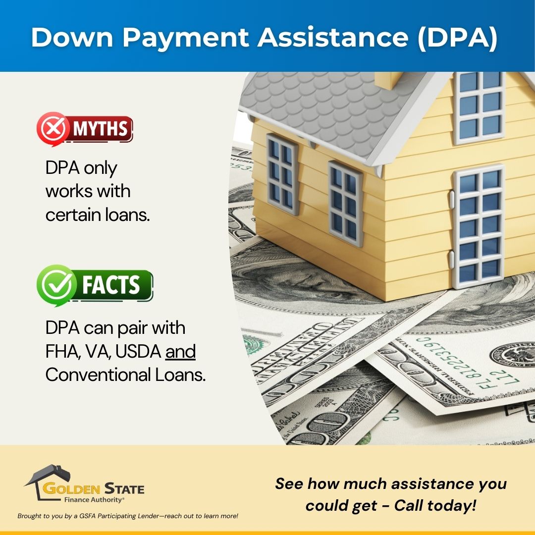 A gold and green graphic featuring a yellow house sitting on top of stacks of money in yellow bands. The headline reads: We'll help with your down payment! Down payment assistance can make homeownership possible with little—or even no-money down, helping you move into your own home sooner than you ever expected.