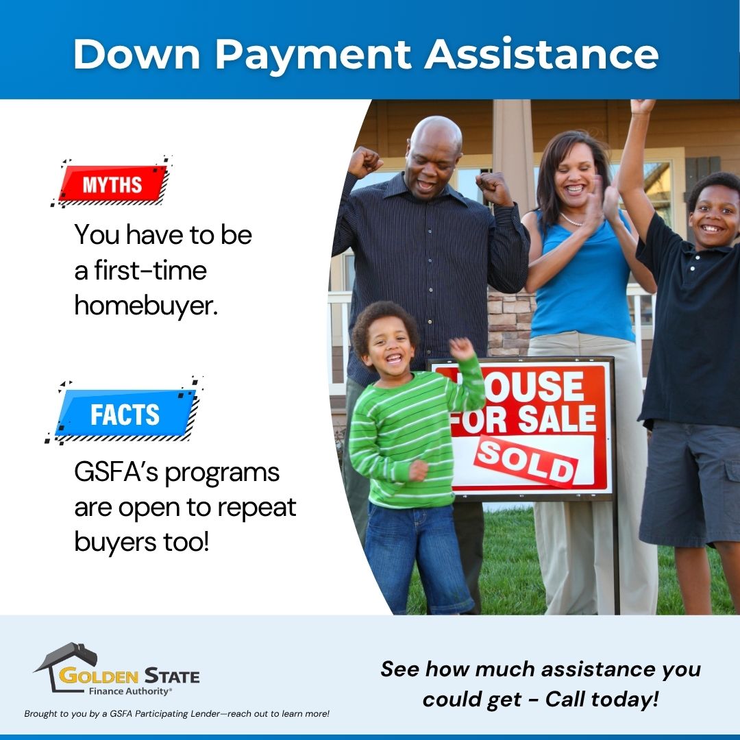 A family celebrating in front of their "SOLD" sign, featuring a man, a woman, and two young boys with their arms in the air. The headline reads: Down Payment Assistance