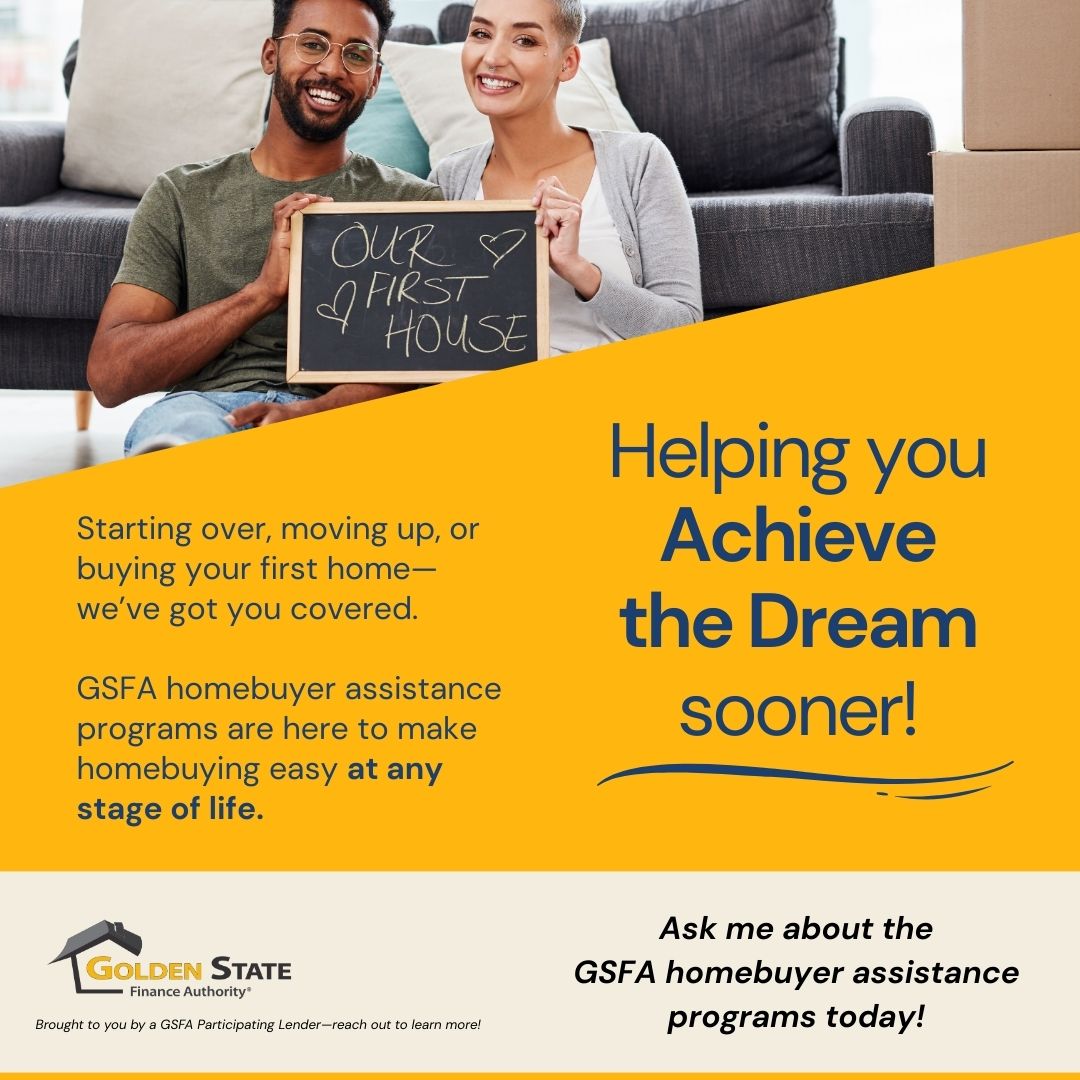 A bright gold graphic featuring a couple sitting in front of their couch, holding a chalk sign that reads “Our First House” with small hearts on it. The headline reads: Helping You Achieve the Dream Sooner! Starting over, moving up, or buying your first home — we've got you covered. GSFA homebuyer assistance programs are here to make homebuying easy at any stage of life.