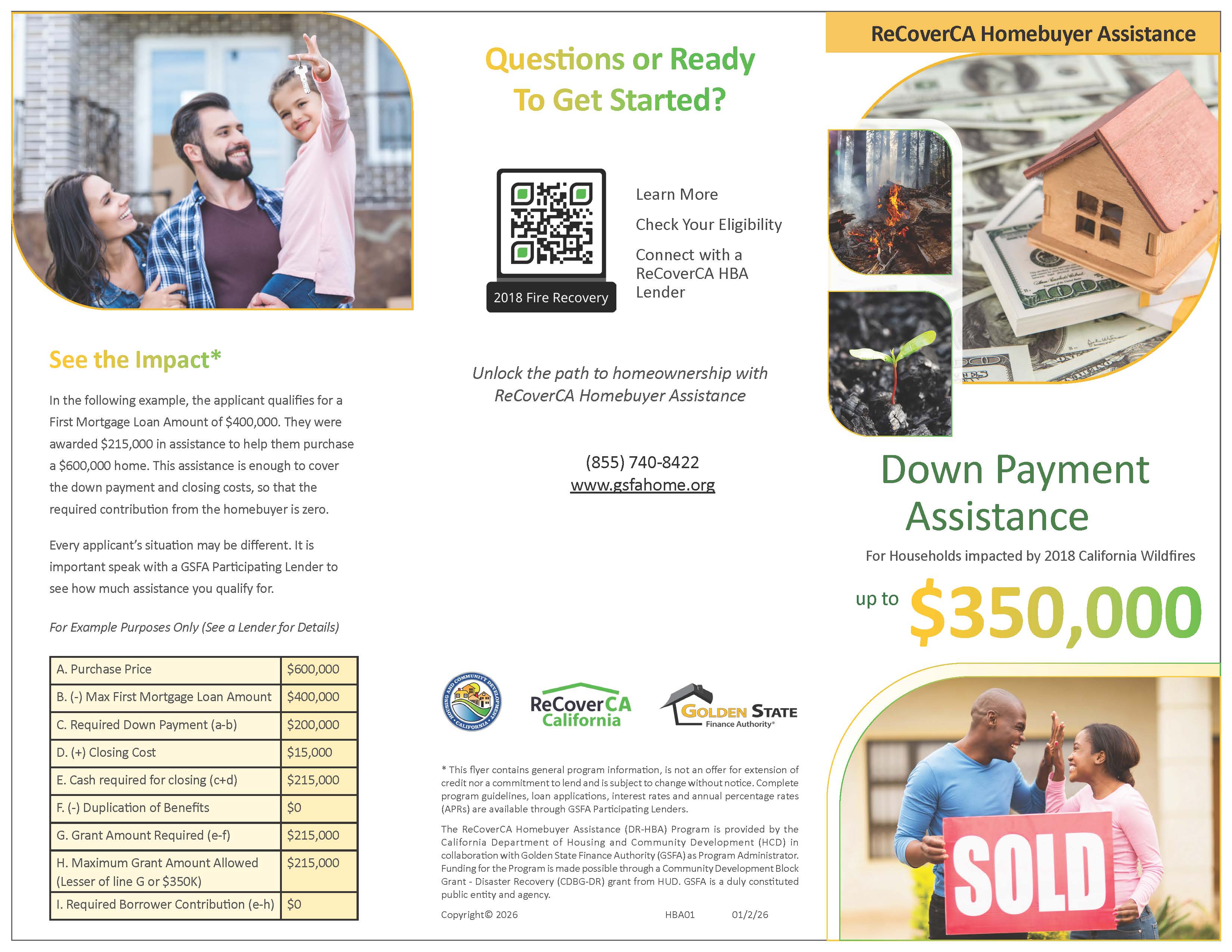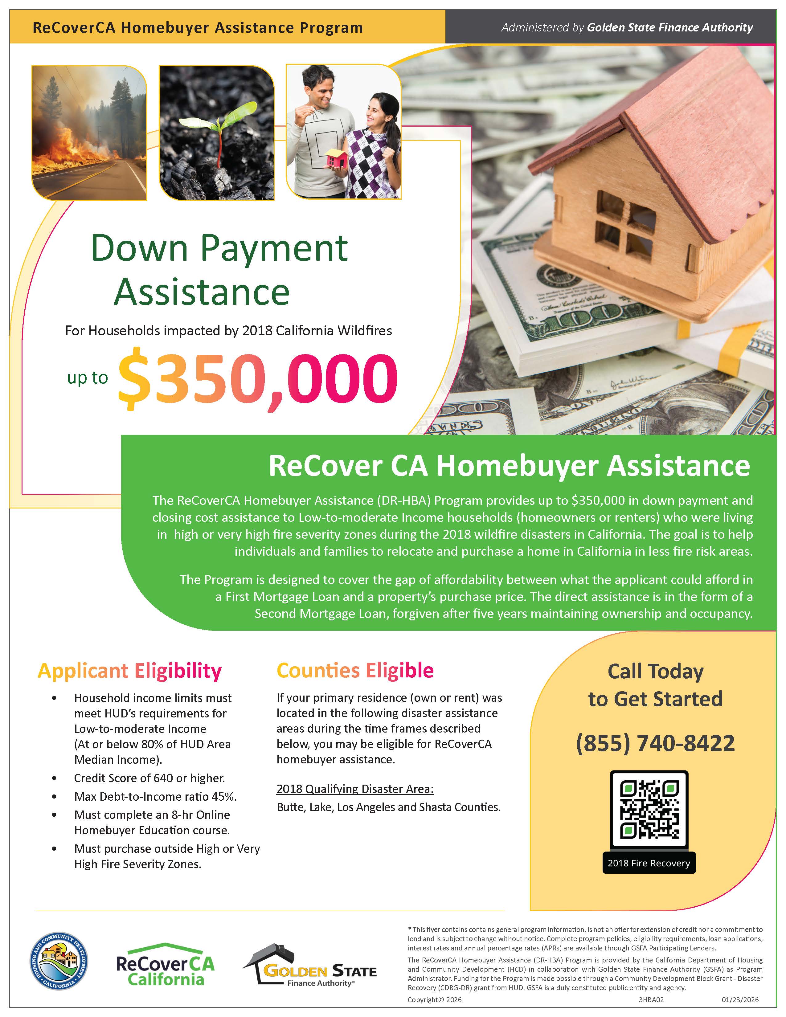 The ReCoverCA Homebuyer Assistance (DR-HBA) Program is provided by the California Department of Housing and Community Development (HCD) in collaboration with GSFA as Program Manager. Funding for the Program is made possible through a Community Development Block Grant - Disaster Recovery (CDBG-DR) grant from HUD.