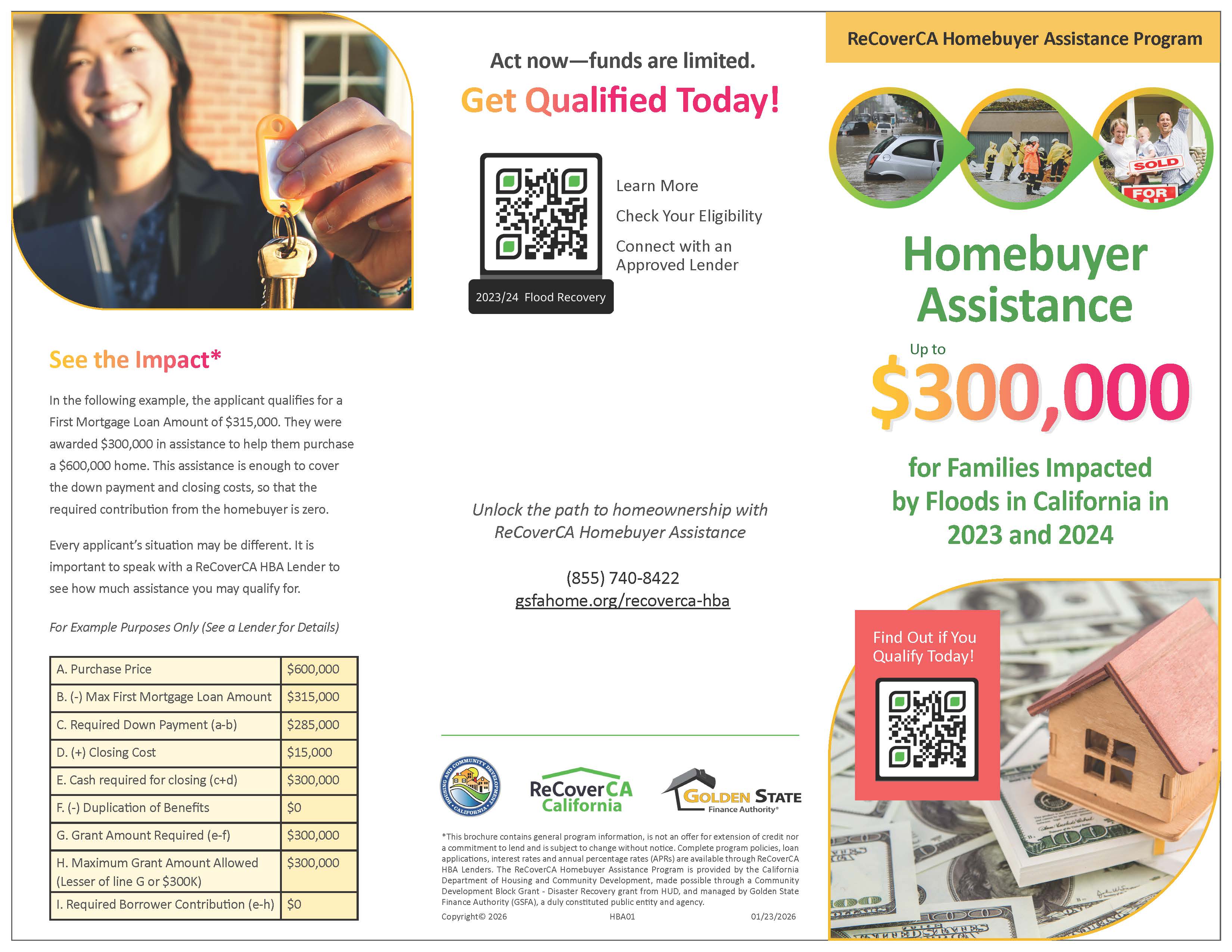The materials below are specific to the 2023/24 Flood Recovery funding under the ReCoverCA Homebuyer Assistance Program and are provided for general informational purposes only. For complete program policies, eligibility guidelines, applications, interest rates, and APRs, connect with a ReCoverCA HBA Lender. Many lenders offer assistance in multiple languages to support you throughout the process.